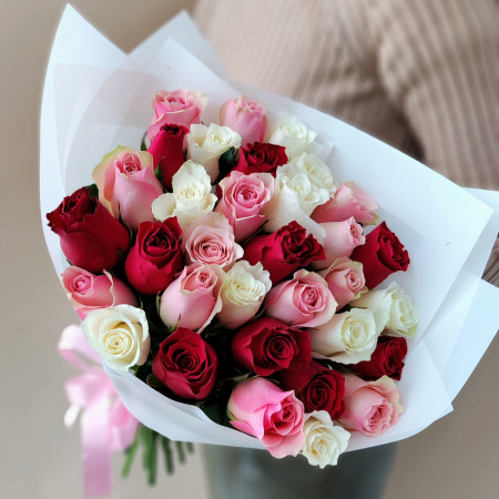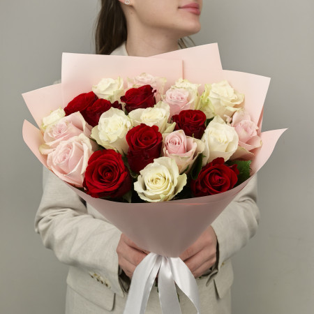 Альстромерия - 4;Роза кустовая - 4;Пленка - 2;Лента атласная - 2;Роза Мисс Пигги (50см) РОССИЯ - 7;Русскус отеч. - 4;